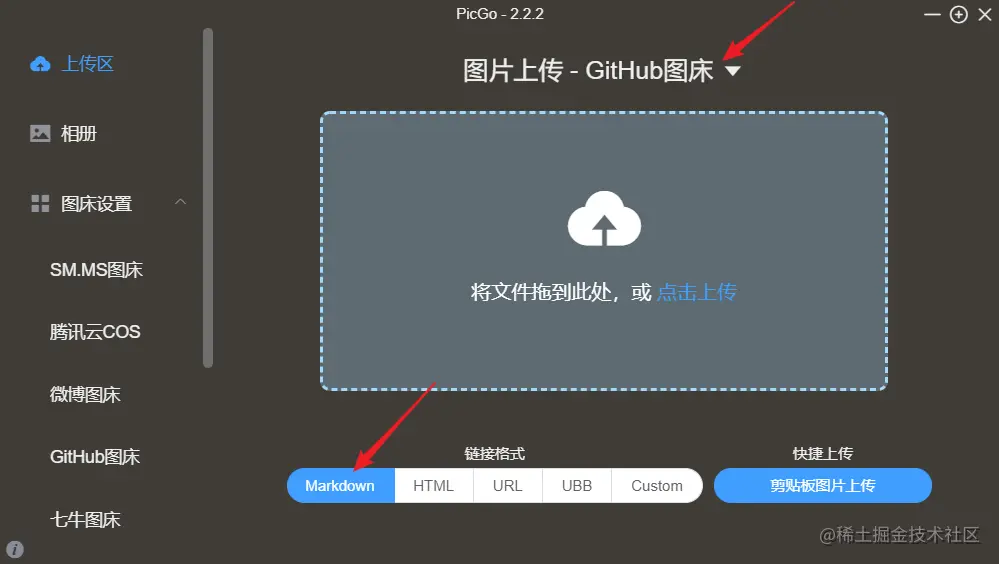 点击上传区,选择图床为 GitHub图床,链接格式为 Markdown ,直接拖动图片到方框里,等待上传完成,会自动复制 Markdown 链接,然后直接粘贴到正在写的博客中就行,非常方便快捷,大大减少了写作中无意义的重复劳动。