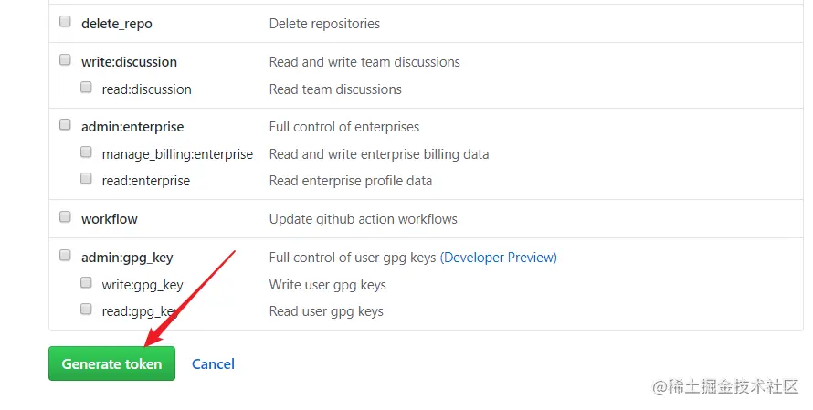 然后点击页面底部的 Generate token ,就生成了 token,记得及时复制并保存下来,页面关闭就看不到了,后面要用到。