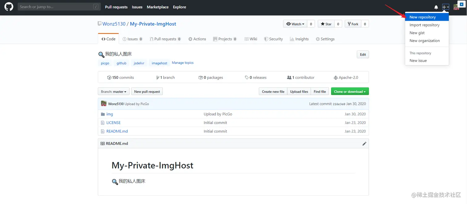 注意: 因为 GitHub 现在支持创建私人仓库了,但是图床仓库不能设为私人的,否则会影响后面的图片超链接显示。一开始我 GitHub 图床仓库设成 Private,测试之后发现博客里的图片并不能成功显示出来,后来我把图床仓库改为 Public 之后,图片就能成功显示了。