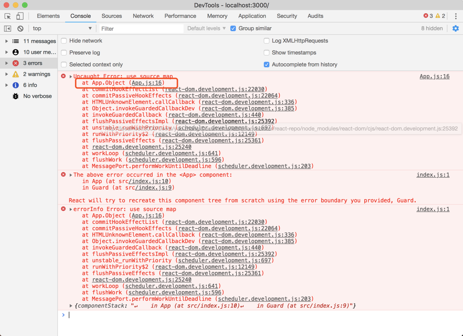在 React 中,有一个 componentDidCatch 的生命周期,它能够捕获子层组件抛出的错误,在这里我们利用它来捕获内层组件的错误,并增加友好性错误提示。