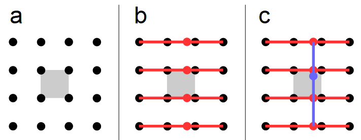 - 通过从四个输入像素的每一行进行水平插值来独立计算四个中间值(红色点)。
