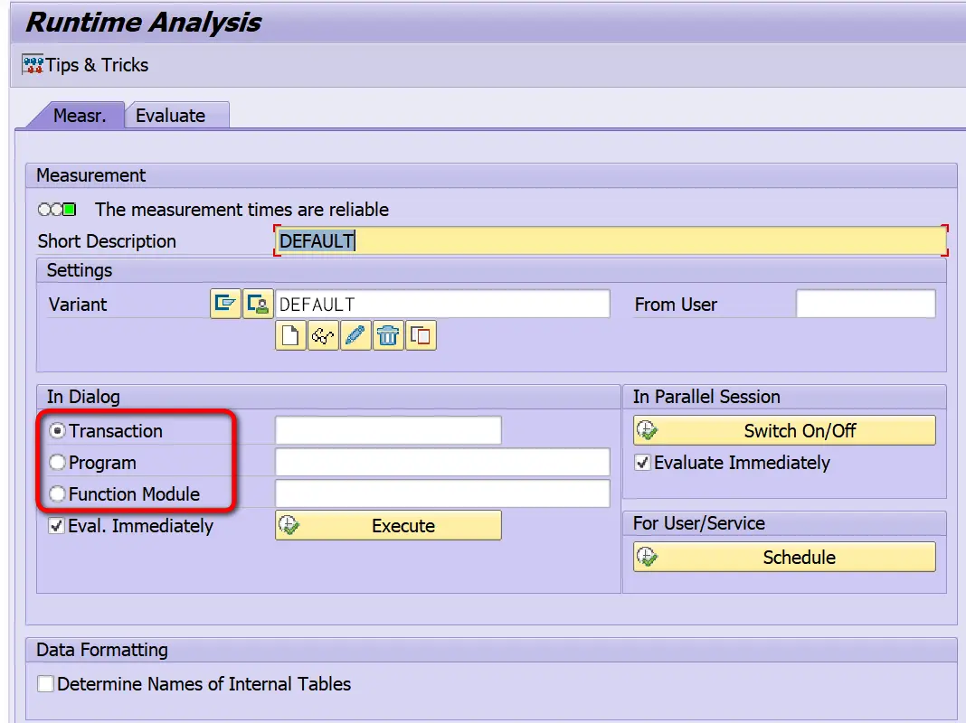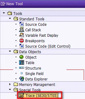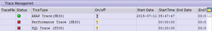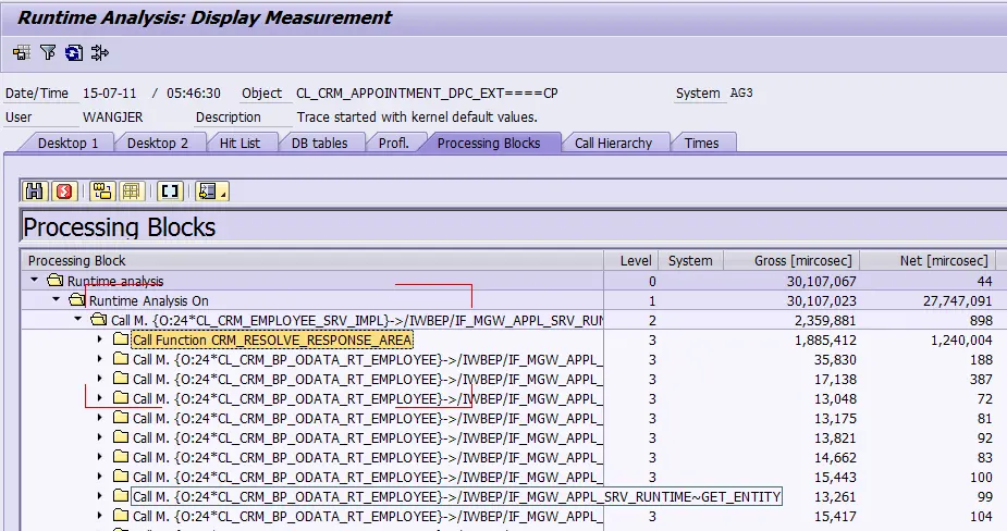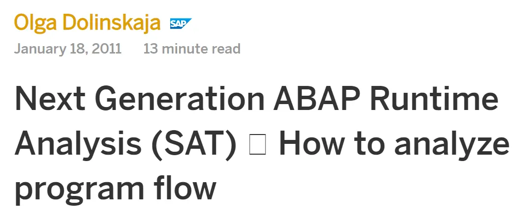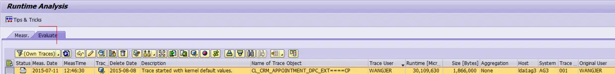 大家最常使用SAT的方式,也就是在上图In Dialog区域里,输入事务码,ABAP报表或者Function Module的名称,然后点击Execute按钮. 如此一来,指定的这些ABAP程序会在SAT Trace模式下运行,自动生成包含了执行性能和调用栈等信息,在程序结束退出Trace模式下之后即可查看。