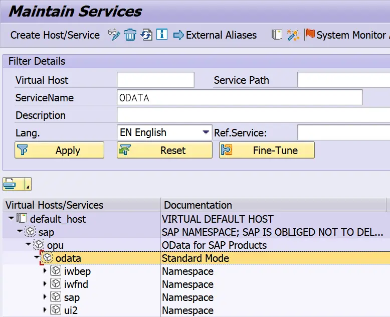 打开事务码SICF,输入OData然后查询,在结果列表里双击OData节点: