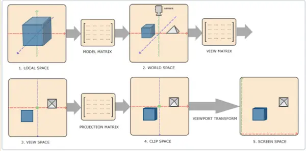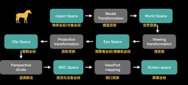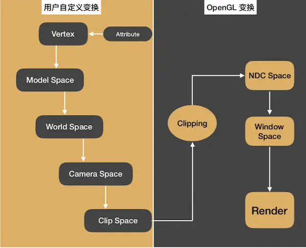 图中右边的两个步骤,包括透视除法,视口变换,这两个步骤是OpenGL自动执行的,在顶点着色器处理后的阶段完成。