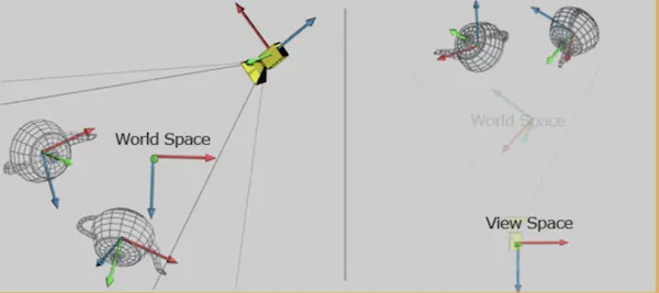 物体坐标系:每个物体都有他们独立的坐标系,当物体移动或者改变方向时,该物体相关联的坐标将随之移动或改变方向。