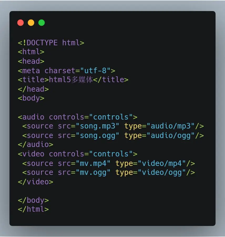 其中source元素的属性src为设置音频和视频的url,type属性设置音频和视频的MIME类型。
