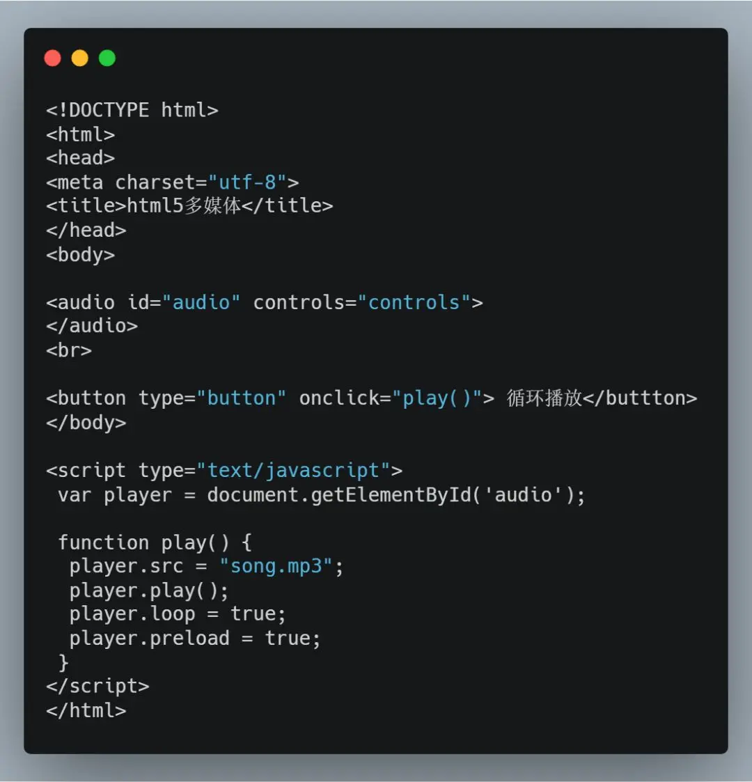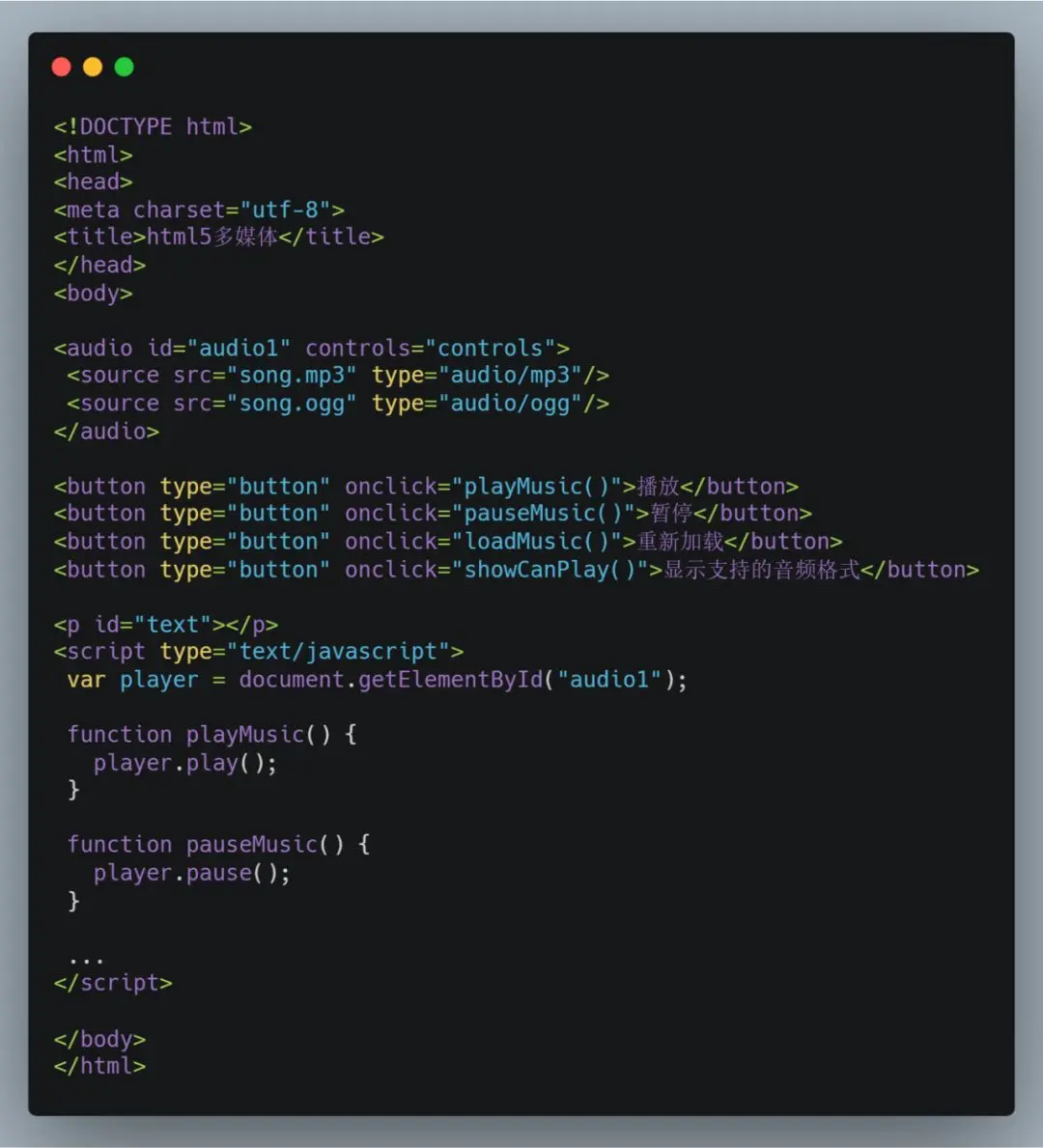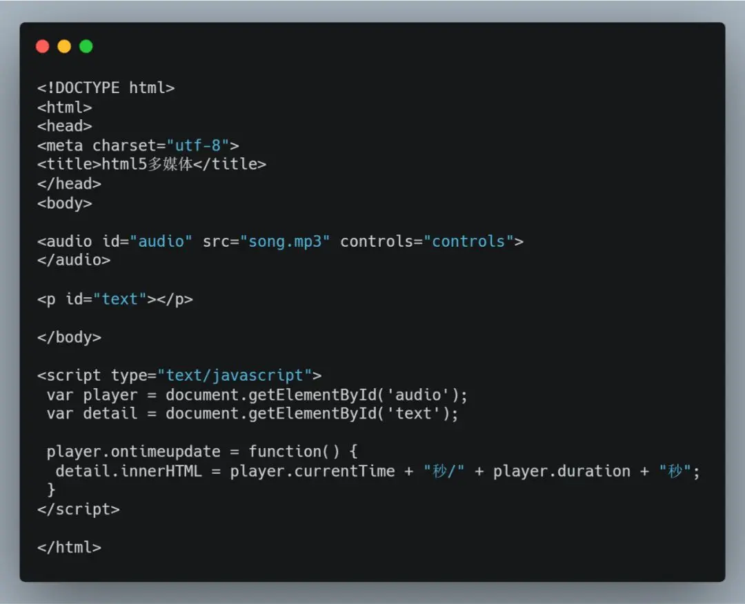 在JavaScript中获取audio元素的对象为HTMLAudioElement,获取video元素的对象为HTMLVideoElement。