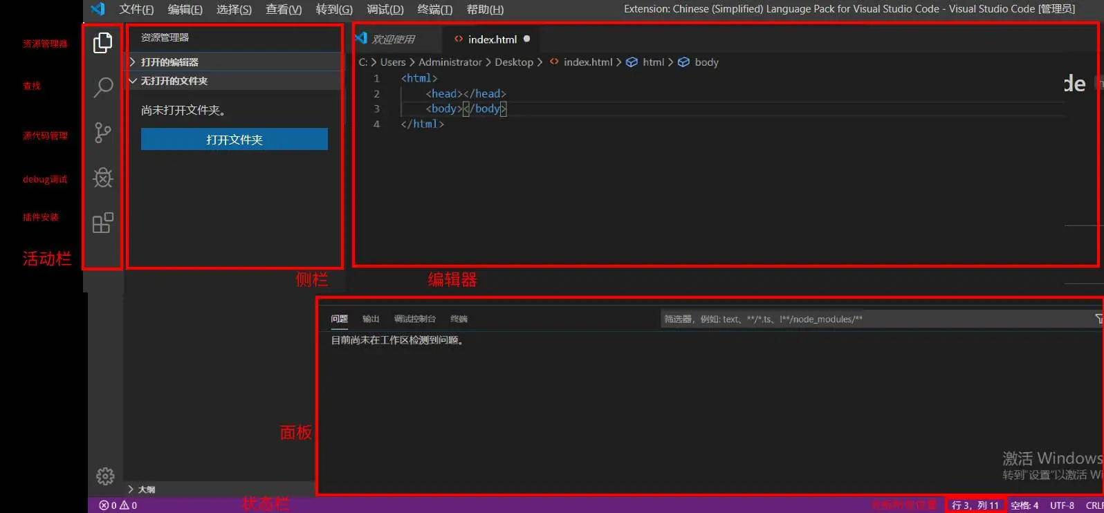 活动栏、 侧栏、 编辑器、 面板、状态栏