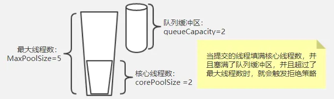 如图,想要了解线程池什么时候触发拒绝粗略,需要明确上面三个参数的具体含义,是这三个参数总体协调的结果,而不是简单的超过最大线程数就会触发线程拒绝粗略,当提交的任务数大于corePoolSize时,会优先放到队列缓冲区,只有填满了缓冲区后,才会判断当前运行的任务是否大于maxPoolSize,小于时会新建线程处理。大于时就触发了拒绝策略,总结就是:当前提交任务数大于(maxPoolSize + queueCapacity)时就会触发线程池的拒绝策略了。