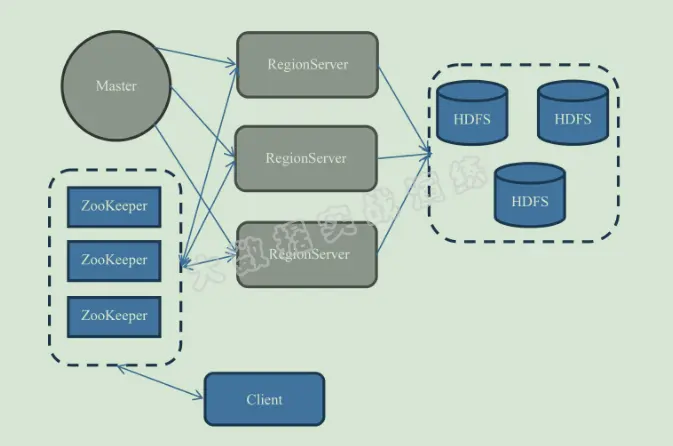 HBase服务依赖于HDFS与Zookeeper。HBase集群又分为:- 一个