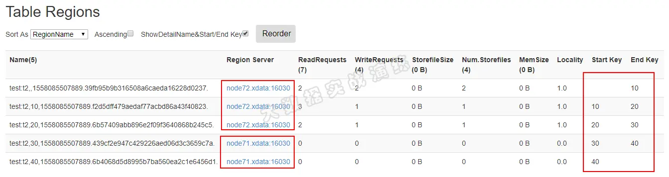 我创建了一个表,内含5个 Region,Master 将 Region 分配到了两个 RegionServer 中,如下图所示: