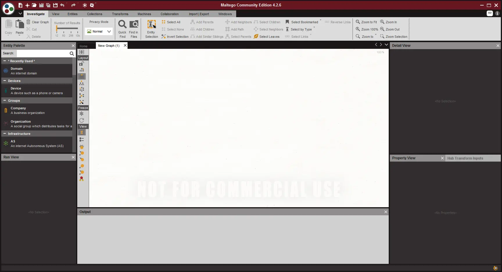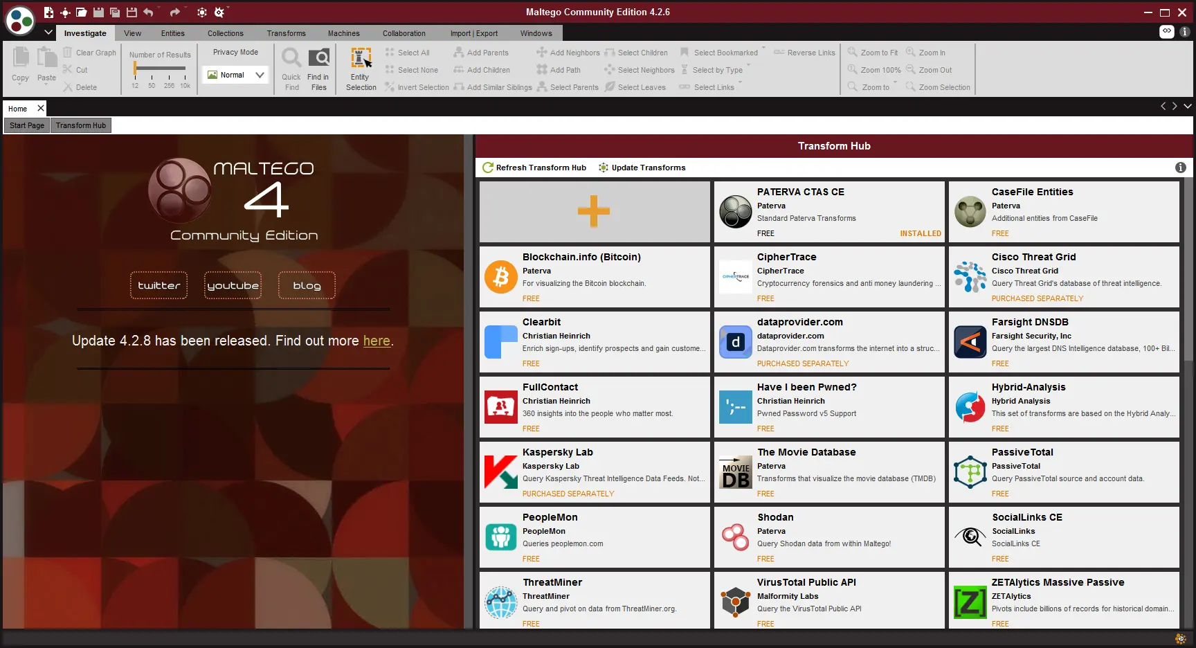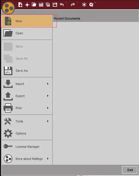 登陆成功后就是这样的页面,右侧是一些插件,但是这个插件并不是每个都能使用的,如果你注册的时候有够细心,就会发现有收费的账号,收费的账号是可以使用maltego所有的功能的,搜索前我们需要New一个项目才能搜索