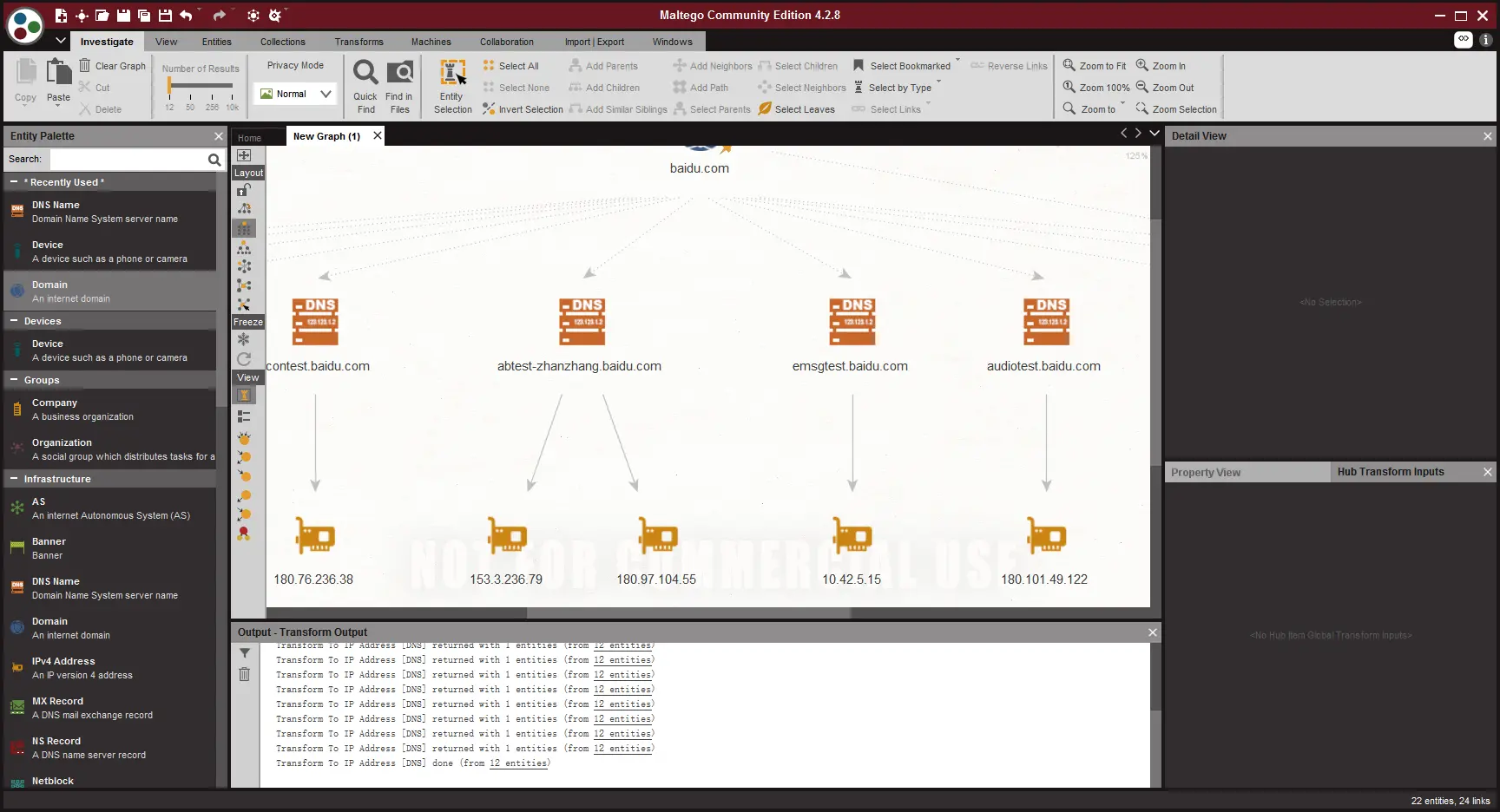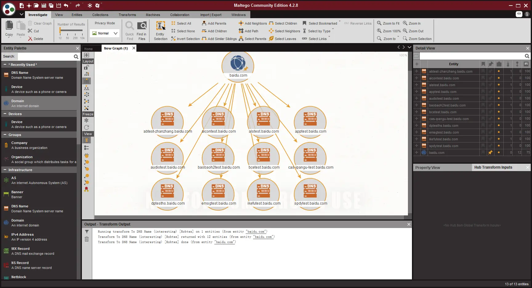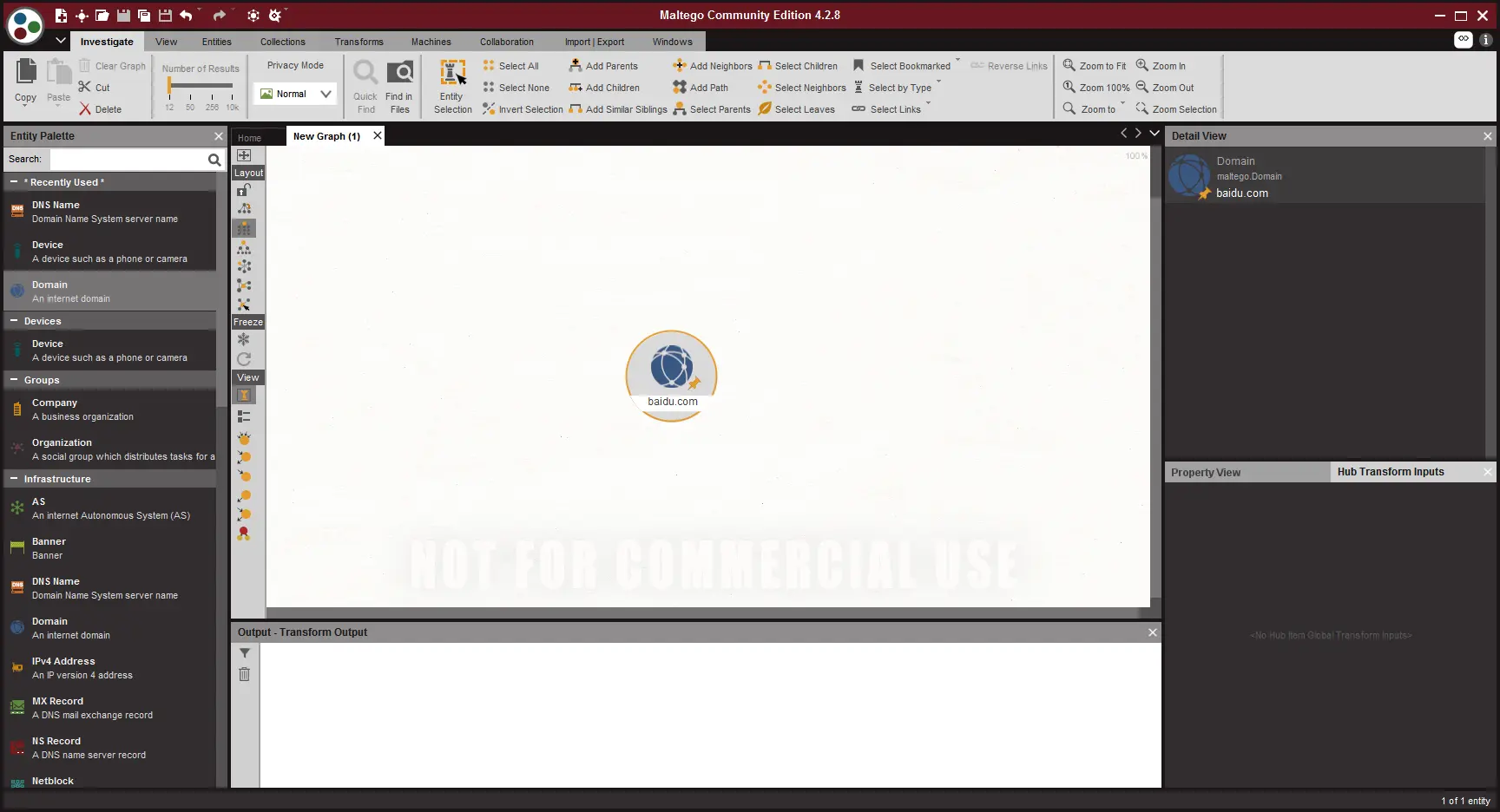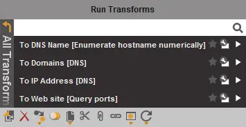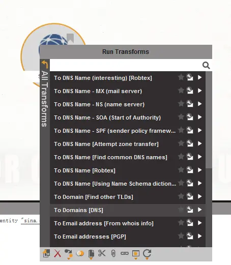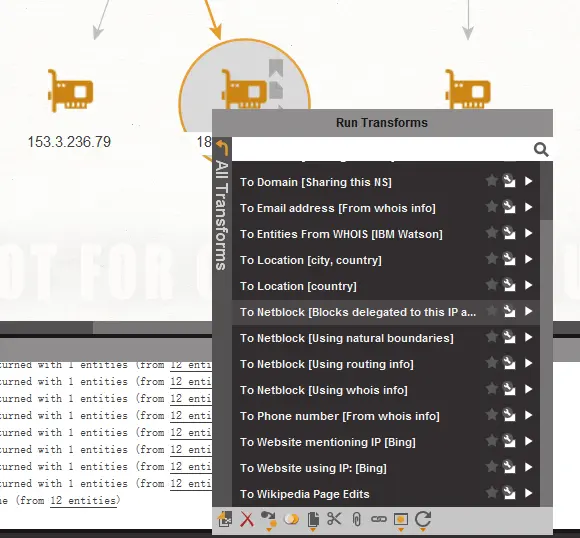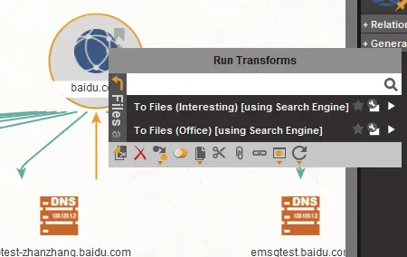 在这个工具内,所有扩展性的信息这个工具都会帮你去完成,所有的扩展信息,在maltego里都被称为,Transforms,当你信息填写好以后,右键图标就可以查看的到