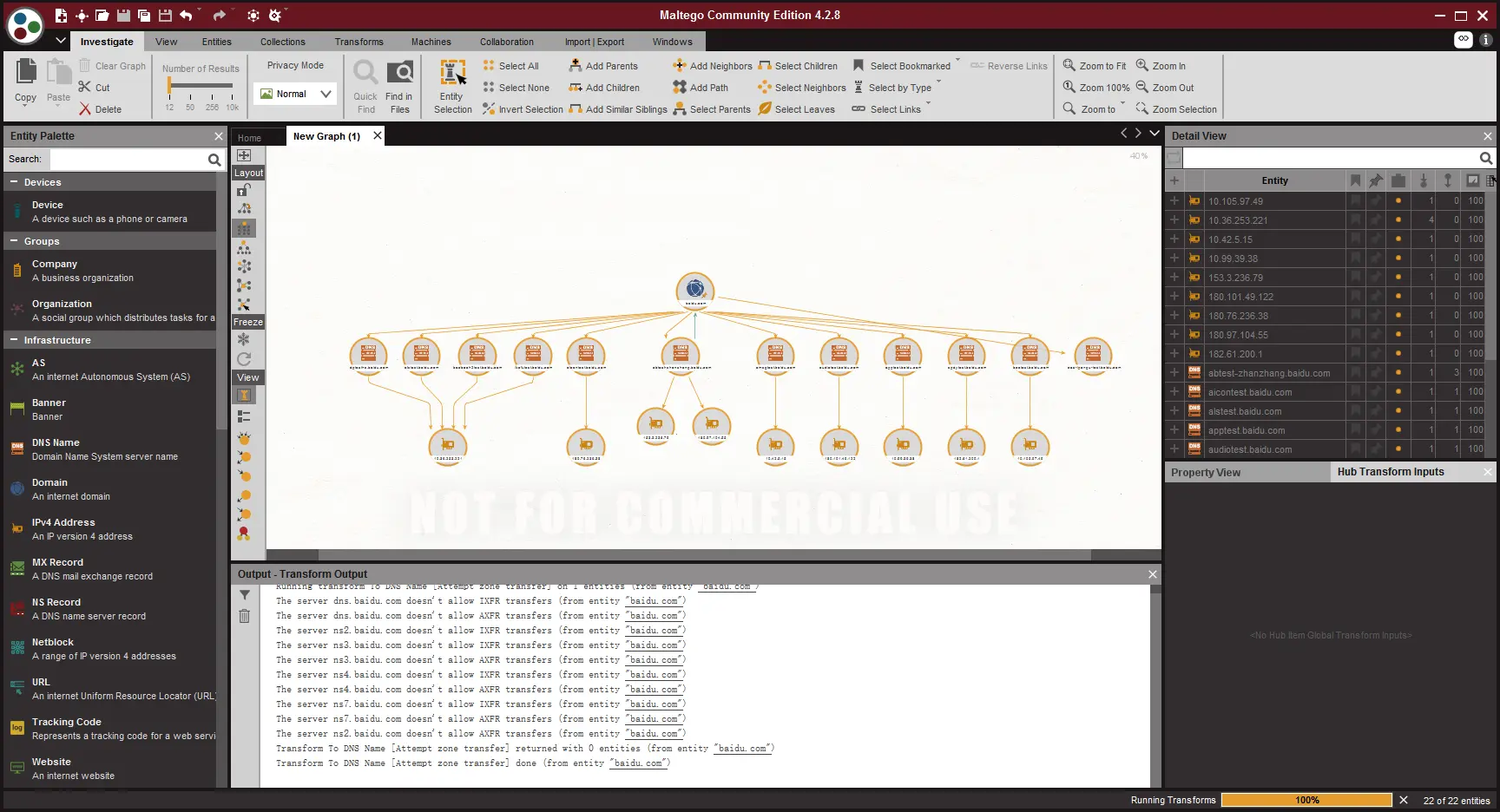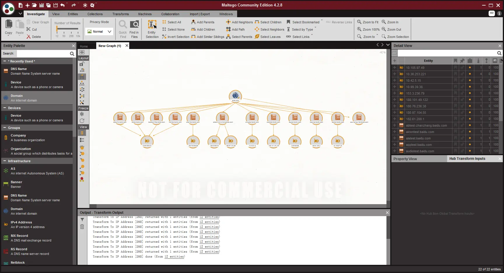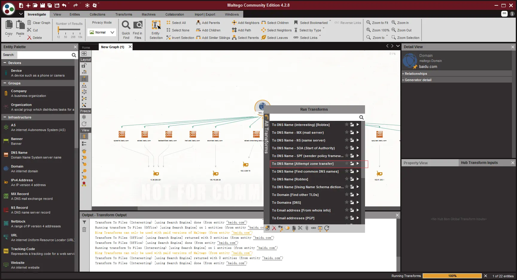 在这个工具内,所有扩展性的信息这个工具都会帮你去完成,所有的扩展信息,在maltego里都被称为,Transforms,当你信息填写好以后,右键图标就可以查看的到