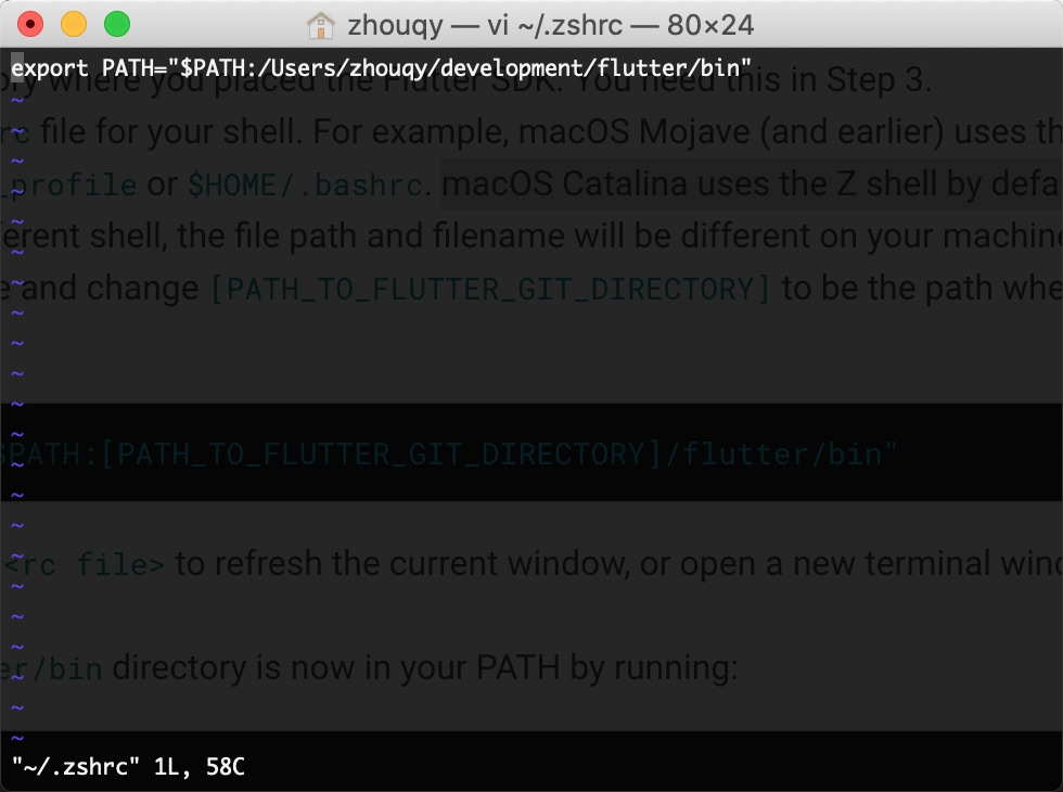 其中:[PATH_TO_FLUTTER_GIT_DIRECTORY]部分用你实际解压flutter sdk的路径替代。 编辑完.zshrc文件后,PATH设置并不会立即生效,需要运行source $HOME/.zshrc文件或重新打开终端方可。 验证Flutter全局路径是否配置成功,在新的终端中执行以下命令:
