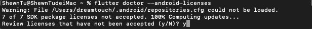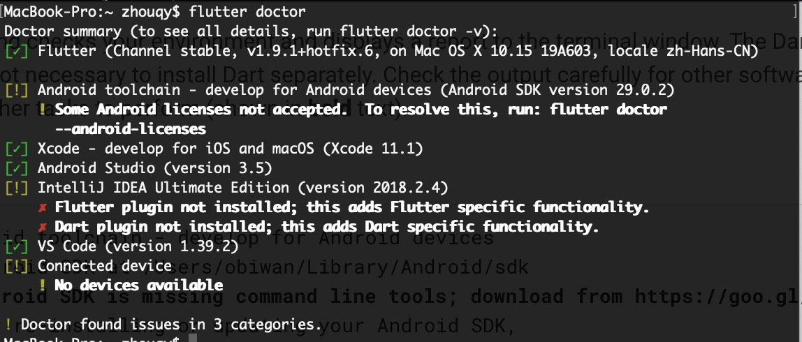 第1个问题 Some Android licenses not accepted, 执行 flutter doctor --android-licences,根据命令行提示,一路y下去即可。 出现这种情况,很可能是Android Studio更新了版本,安装了新版的Android SDK所致。
