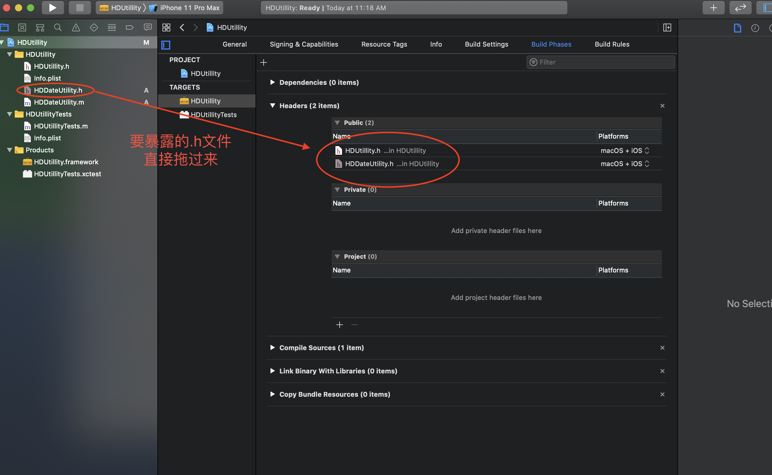 点击:工程文件 - Target - Build Phases - Headers,headers下面有3个归类,把你要暴露的.h文件直接拖到Public里面。