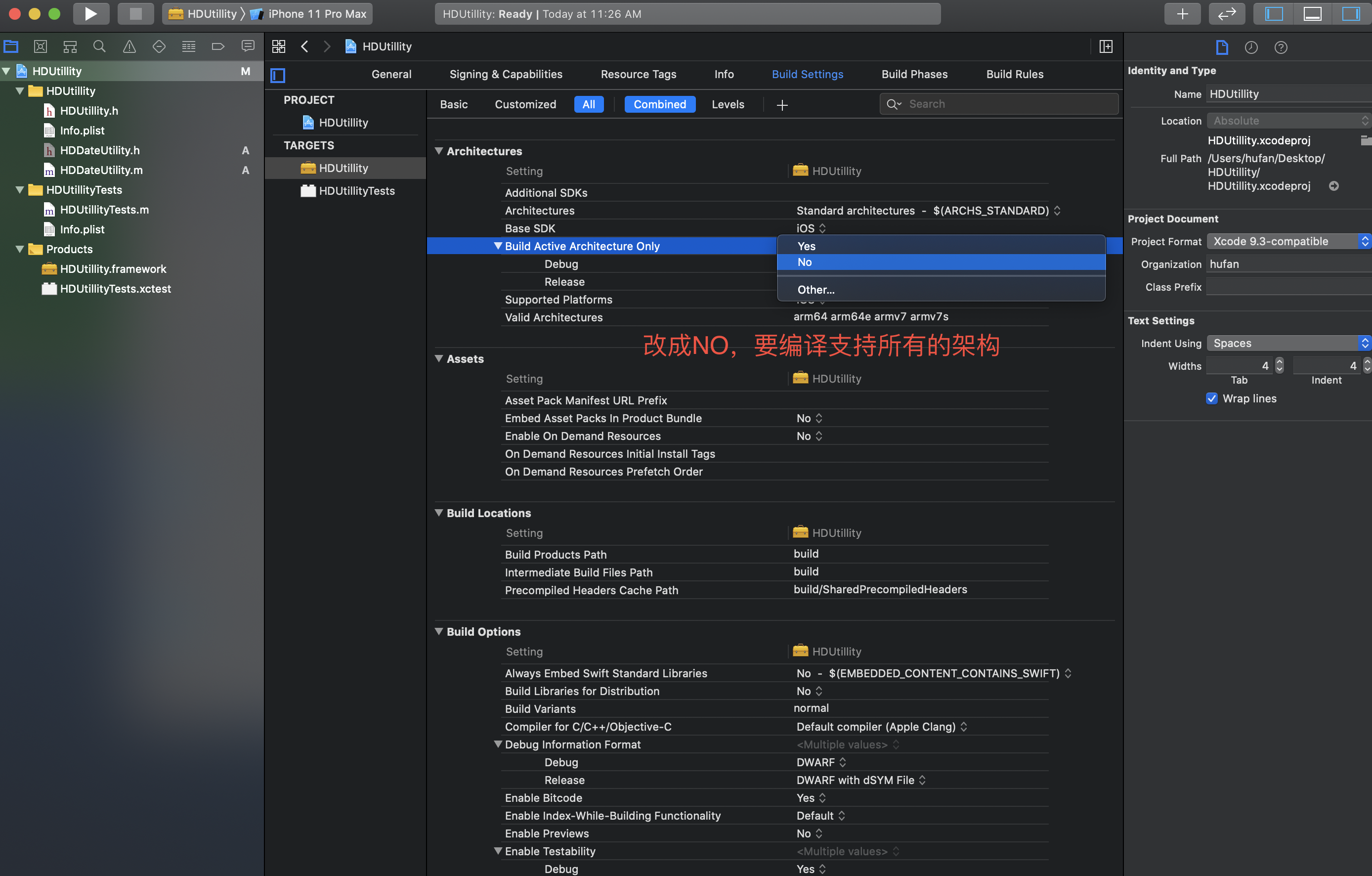 Build Setting选项Build Active Architecture Only选择NO,顾名思义,所有架构都要编译。