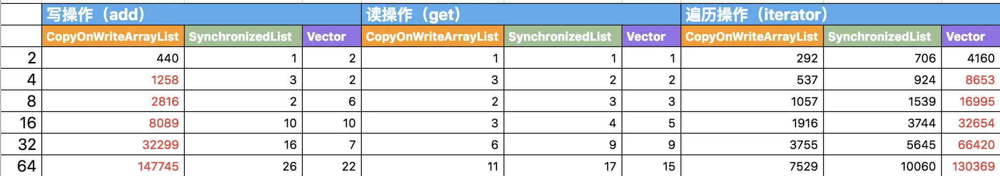 Vector对所有操作进行了synchronized关键字修饰,性能应该比较差CopyOnWriteArrayList在写操作时需要进行copy操作,读性能较好,写性能较差Collections.synchronizedList性能较均衡,但是迭代操作并未加锁,所以需要时需要额外注意