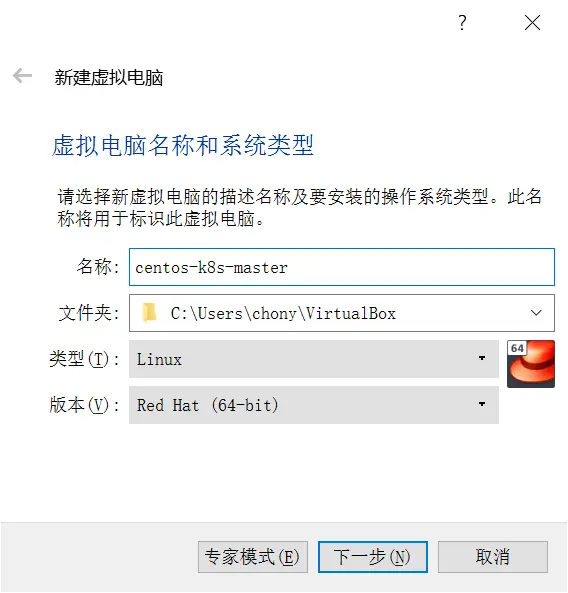 - 新建虚拟机,因为Centos其实是RedHat的克隆版,所以版本类型选择RedHat(64-bit)