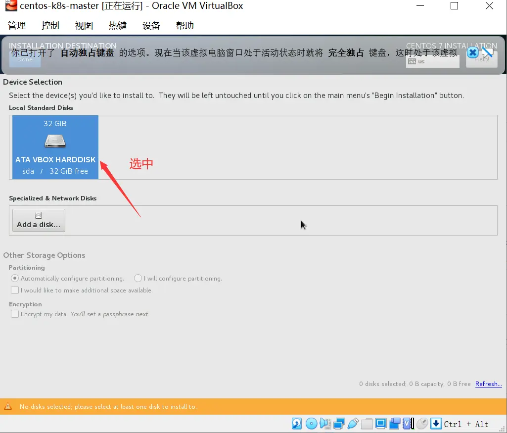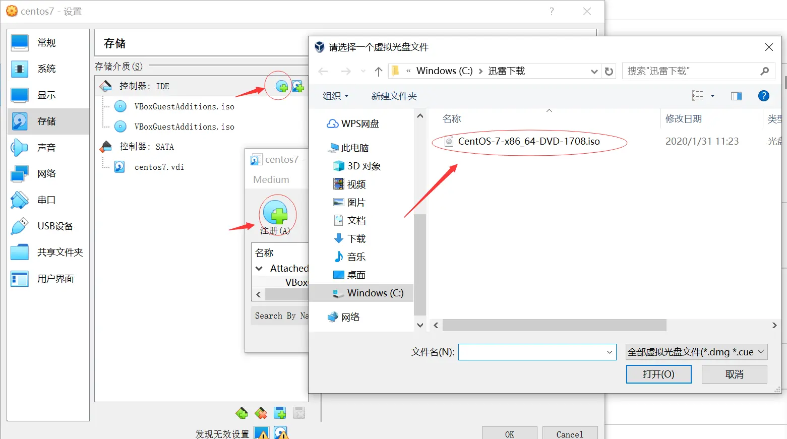 - 配置,系统->存储,点击添加虚拟光驱,注册加载Centos7镜像