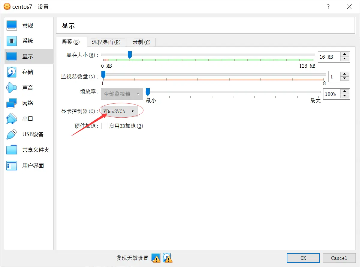 - 配置,系统->屏幕,设置显卡控制器为VBoxVGA,否则进入Centos7图形界面后有时会鼠标会失控。