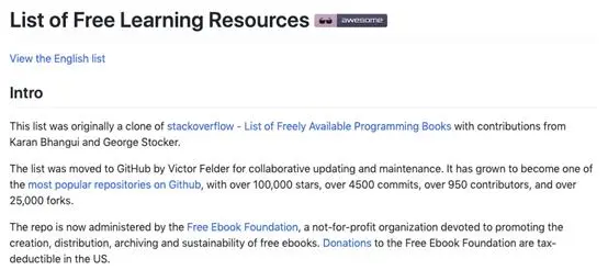 该库拥有多达135,000星,这绝对是Github上最受欢迎的一个库。里面提供了许多免费的编程书籍、屏播、播客,甚至各种在线课程。如果你在寻找学习资源,还犹豫什么,这个库是最好的选择