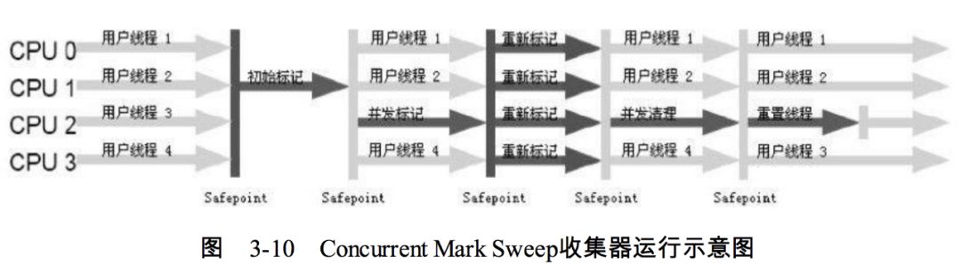 并发标记(CMS concurrent mark):从 GC Roots 遍历整个对象图,耗时较长,但无需停顿用户线程(可与用户线程并发执行);