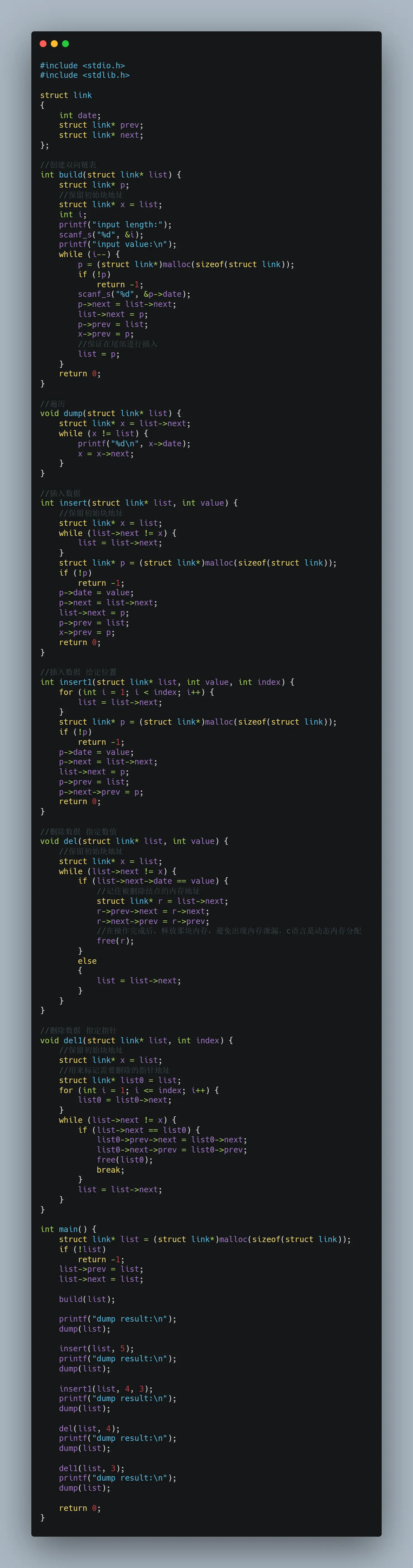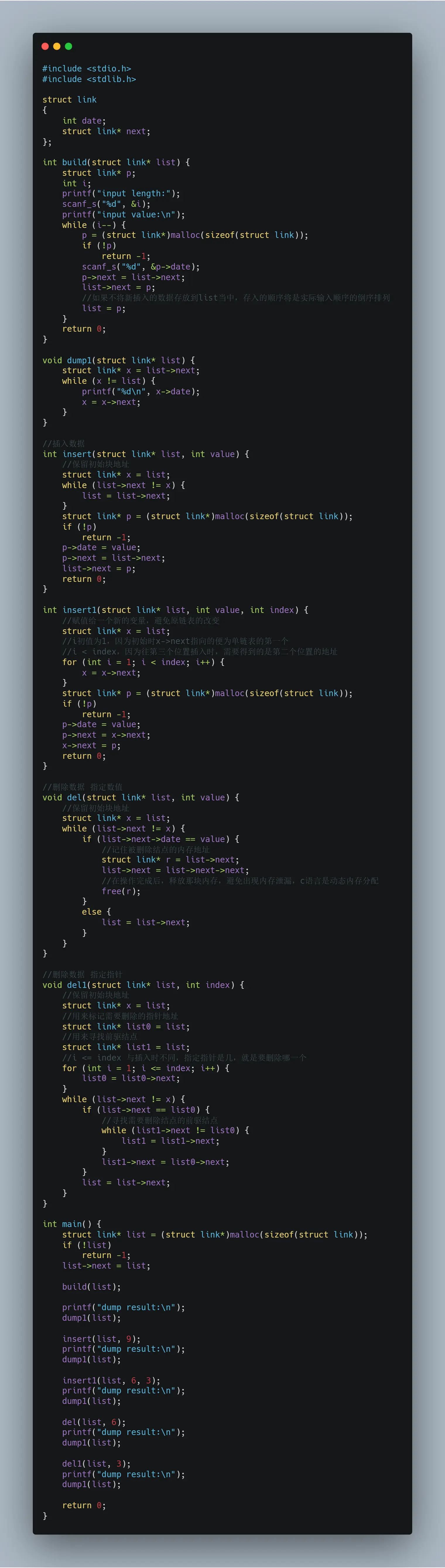 因为在前面的实现过程中,我的考虑不是很全面,导致后面在它们的基础上进行修改的时候出现了很多问题,在循环链表的实现当中,我在几乎每一个函数前面都加了一条语句 struct link* x = list; 为了将链表头结点的内存地址给保留下来,在前面的实现当中,为了保证插入数据的时候在末尾插入,我将list的值进行了移动,导致现在需要头结点的内存地址时没有任何的保留了。