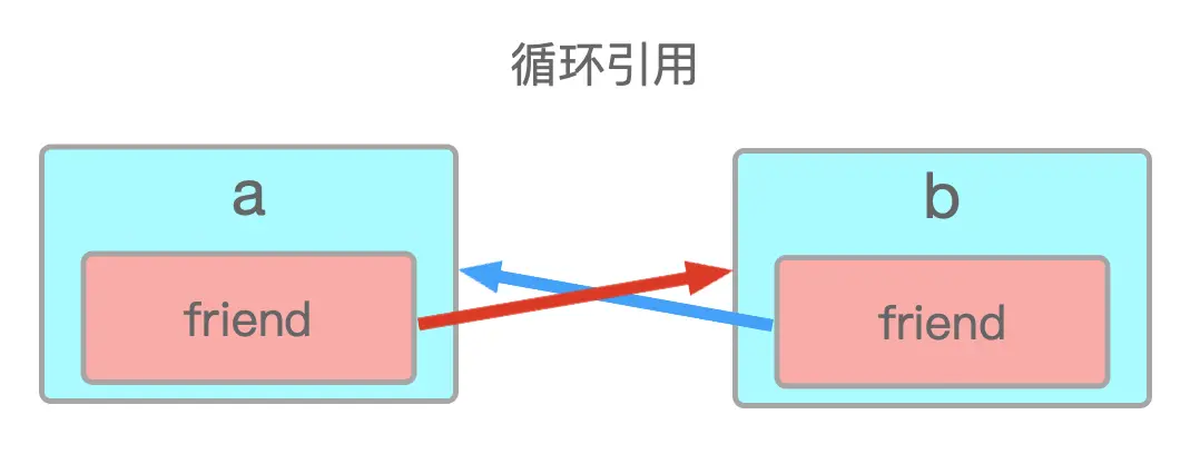 上述代码创建了 a 和 b 两个 Student 实例,并把它们各自的 friend 字段赋值为对方,除此之外,这两个对象再无任何引用,然后将它们都赋值为 null,在这种情况下,这两个对象已经不可能再被访问,但是它们因为互相引用着对方,导致它们的引用计数都不为零,引用计数算法也就无法回收它们。如下图所示: