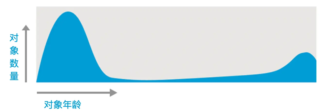 与其说是算法,不如说是理论。如今大多数虚拟机的实现版本都遵循了“分代收集”的理论进行设计,这个理论可以看作是经验之谈,因为开发人员在开发过程中发现了 JVM 中存活对象的数量和它们的年龄之间有着某种规律,如下图:
