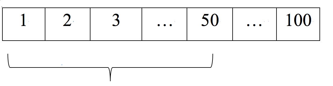目标是以最少的次数从这个100个数字中找到指定的数字。通常思路是,我们需要从1开始一个一个比较,如果指定的数字是100,那么用这种傻找的方式需要找100次。如果范围扩大到1000,查找1000,那么相应地就需要找1000次,依次类推。