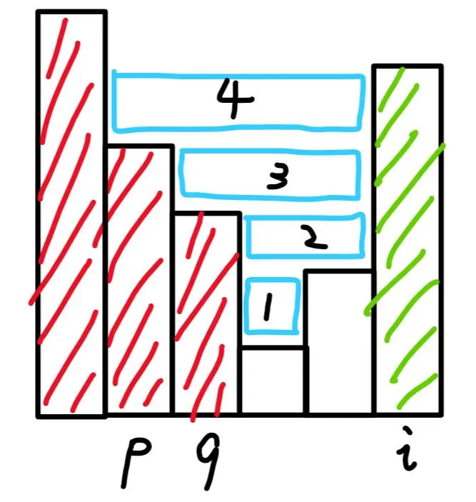 红色表示栈里的元素,白色表示已经出栈了,绿色表示当前准备进栈的元素。那么这时候我们上面求的就是 3 号水块的面积,而 1 和 2 水块在之前进栈操作中就已经求出来了, 4 水块的话在之后(q 出栈,p 和 i 进行比较)也会被计算到。