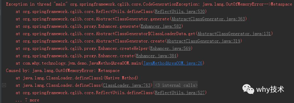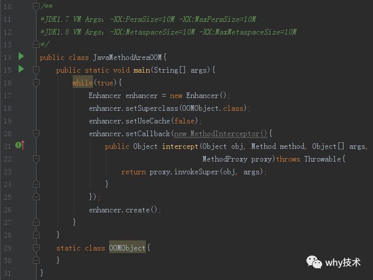 知道它存放的东西是Class相关信息了,那我们不停的往里面放入类,不就溢出了吗。 接下来问题又来了,我们怎么在运行时产生大量的类去往方法区里面放呢? 在书中作者给出的示例代码,是借助CGLib直接操作字节码运行时生成了大量的动态类。 如下:需要多说一句的是,书中的JDK版本是1.7,我的JDK版本是1.8。因为JDK1.8中用Metaspace代替了Permsize,因此在我们设置VM Args的时候需要有所变化,正如上面图片展示的那样。