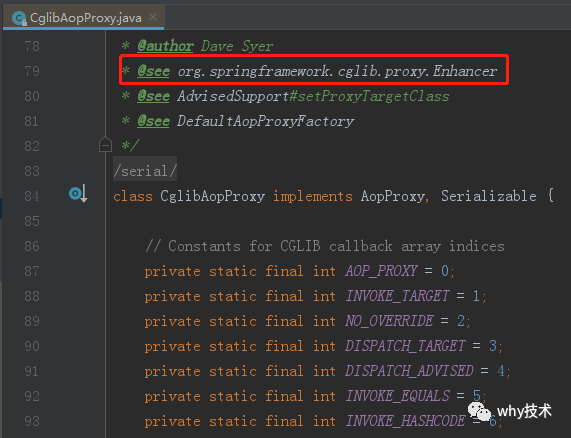 而对于使用CGLib字节码增强技术的这种场景,可以说是非常常见了。我们常用的Spring框架中就有大量的CGLib技术的应用。随便截个源码的图片,比如这个CglibAopProxy。