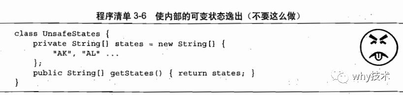 如果按照上述方式来发布states,就会出现问题,因为任何调用者都能修改这个数组的内容。在程序清单3-6中,数组states已经"逸出"了它所在的作用域,因为这个本应该是私有的变量已经被发布了。