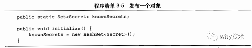 如程序清单3-5所示:在initialize方法中实例化一个新的HashSet对象,并将对象的引用保存到knownSecrets中以发布该对象。