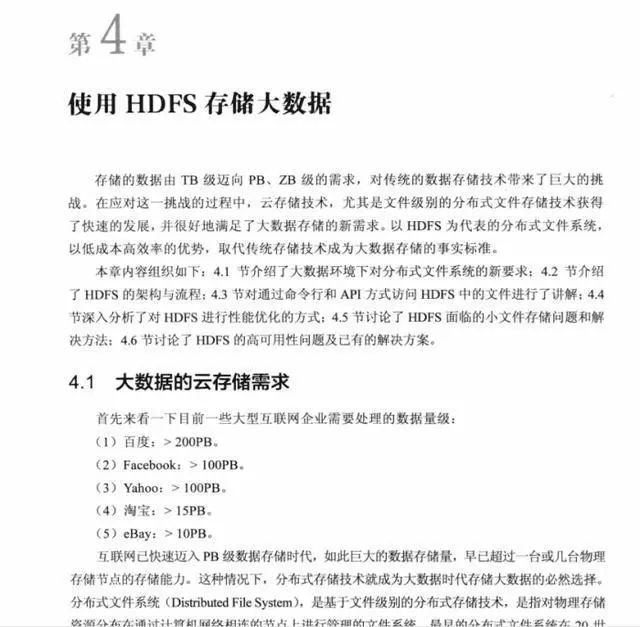 第4章全面讲解了HDFS分布式文件存储系统的工作原理和机制,说明了使用命令行和代码对HDFS文件进行操作的方法,介绍了提高文件访问效率的若干重要优化方法,并梳理了目前解决HDFS中小文件存储和高可用性问题的解决方法。