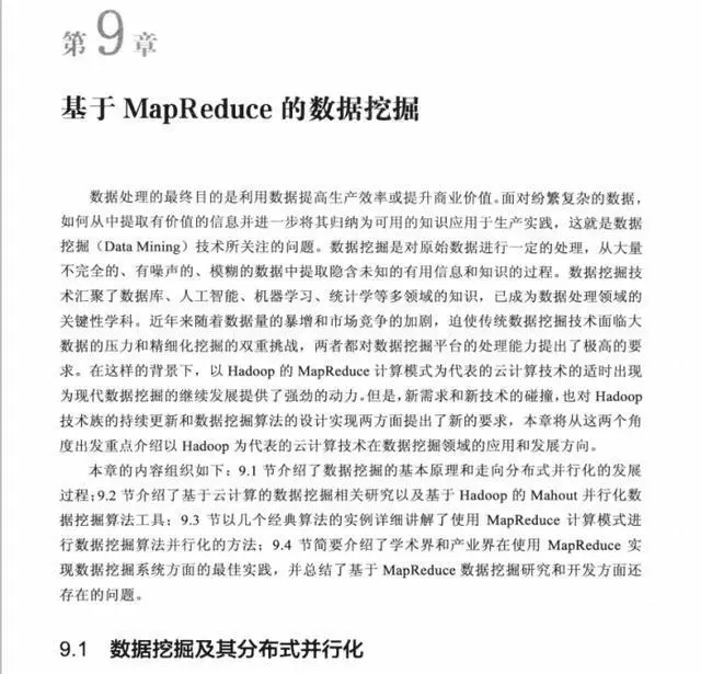 第9章重点介绍基于MapReduce的数据挖掘技术,包括基本原理和方法、若干经典算法的实例,以及目前已有的基于MapReduce的数据挖掘工具。