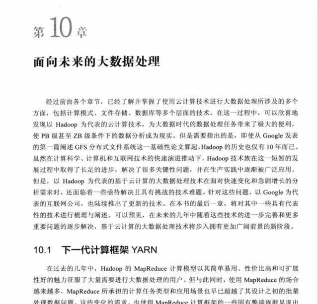 第10章介绍了将对未来大数据处理技术产生深远影响的一些新型大数据处理技术,包括Hadoop的下一代计算框架YARN、大数据的实时交互式分析工具Dremel和Impala、大数据的图运算模型和工具Pregel和Hama。
