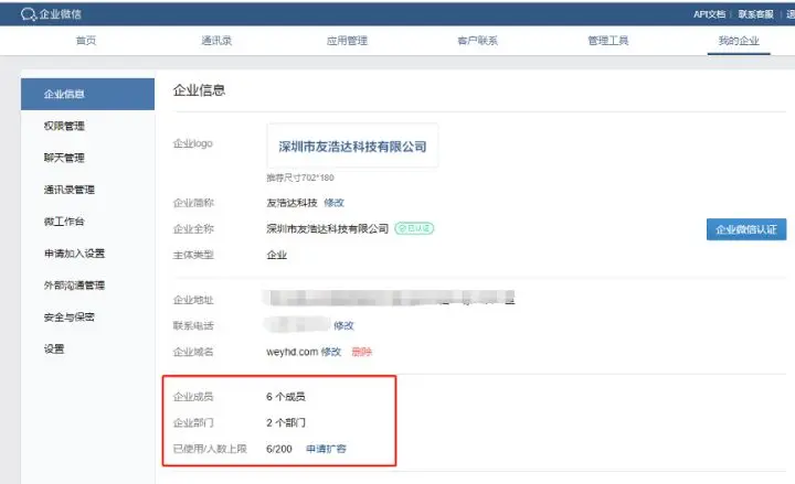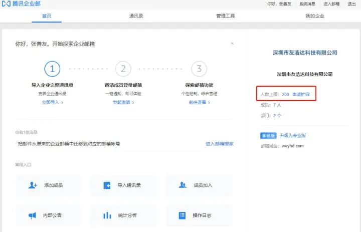 4. 企业邮箱:电子邮箱作为最基础的协作工具,我选择的是腾讯企业邮。在腾讯企业邮管理后台,添加公司的域名Weyhd.com, 每个员工入职后即可拥有一个企业邮箱帐号。腾讯企业邮默认支持200人,通过微信公众号等方式进行企业认证后还可以免费扩容。
