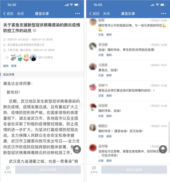 (图为武汉一家专业医疗检测机构,康圣环球。他们在疫情期间通过乐享活动来进行志愿者、返岗人员的数量名单统计,员工纷纷留言“随时待命!”)