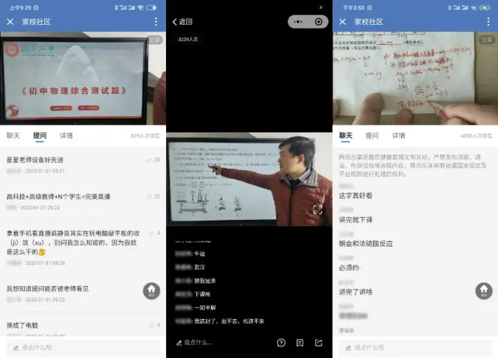 (图为江西临川二中用乐享对学生进行远程直播授课,老师们各出奇招,有的用自拍杆固定手机,有的把手机绑在台灯上,还有老师用两根绳子吊着手机直播)