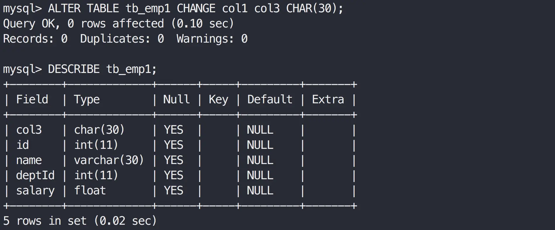 ALTER TABLE tb_emp1 CHANGE col1 col3 CHAR(30);