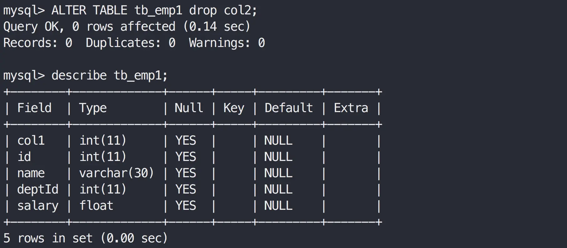 ALTER TABLE tb_emp1 drop col2;