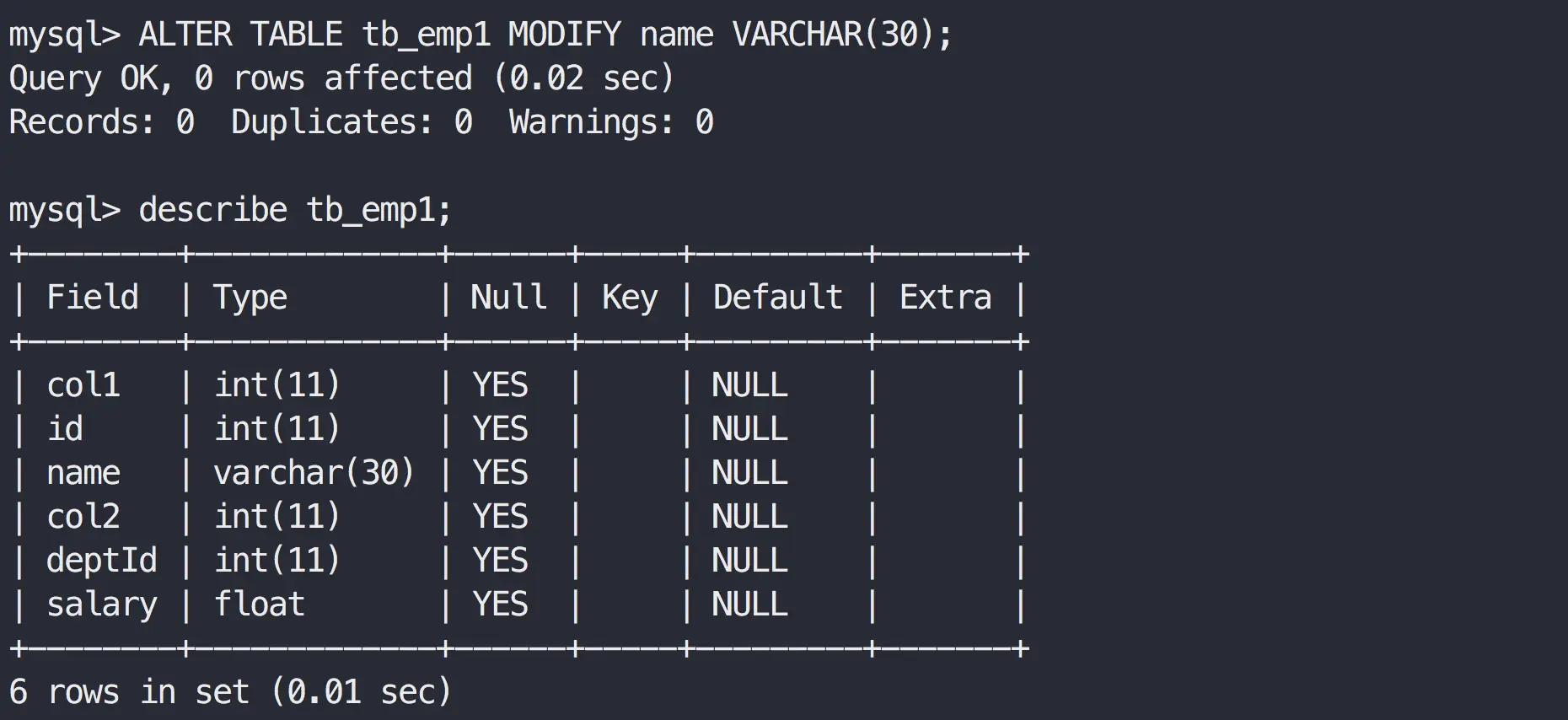 ALTER TABLE tb_emp1 MODIFY name VARCHAR(30);