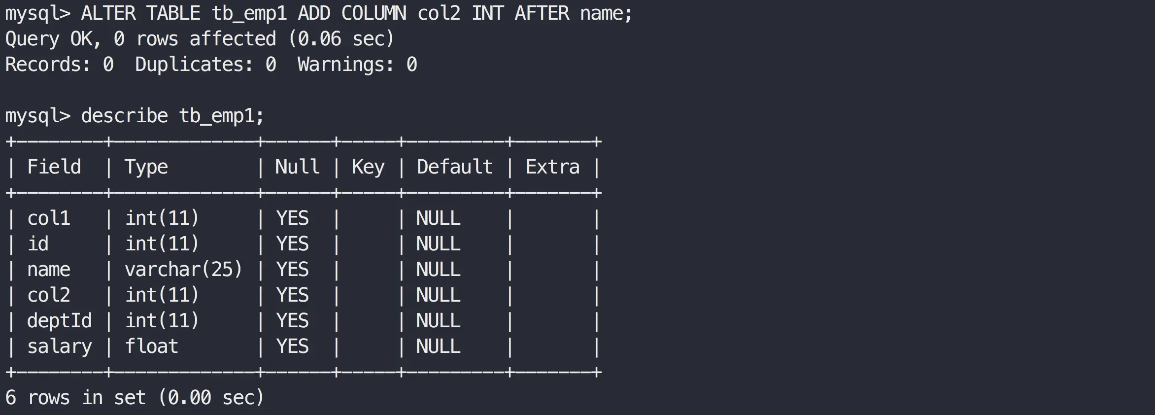ALTER TABLE tb_emp1 ADD COLUMN col2 INT AFTER name;