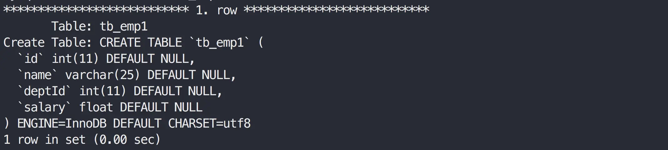 SHOW CREATE TABLE tb_emp1\G