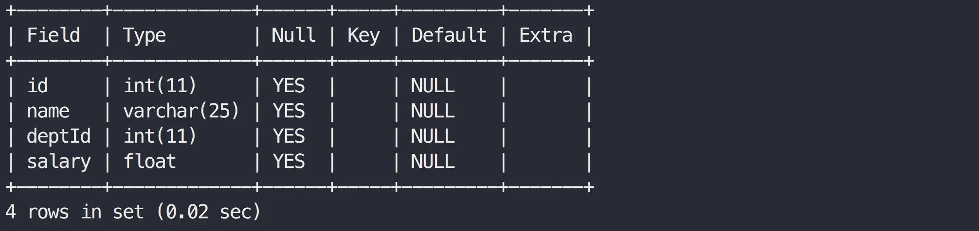 CREATE TABLE tb_emp1(id INT(11),name VARCHAR(25),deptId INT(11),salary FLOAT);
